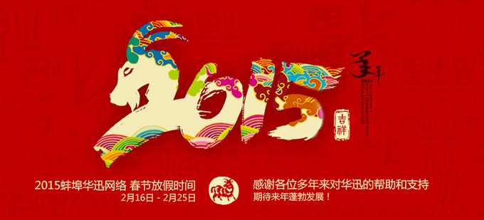 蚌埠華迅網(wǎng)絡(luò)科技有限公司2015新年放假時(shí)間為2015年2月16日至2月25日,假日期間如有需求請聯(lián)系:0552-3711772 15255232273